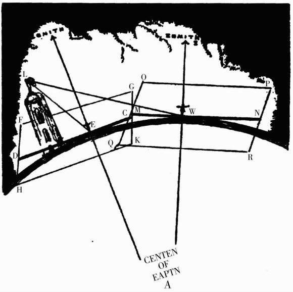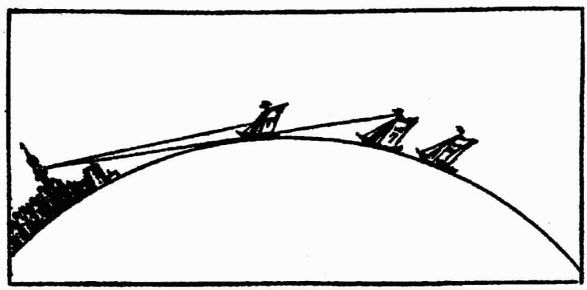假如你站在一个建立在一个巨大的球体表面的高塔脚下,塔顶部正飘扬着一面旗帜,你会发现,只要你一直站在那里,这面旗子就在你的头顶正上方。如果你离开高塔,你看旗子的视线就会出现一个角度,正如图所示,这个角度要取决于你距离高塔的长度。