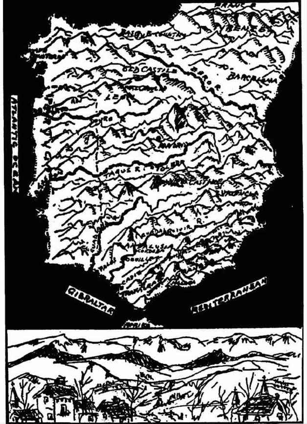 在西班牙,山脉呈水平走向,我们几乎可以说它们是看得见的纬度。只要看一眼地图,你就会理解为什么这些山脉会成为任何有序发展的障碍。让我们首先看比利牛斯山脉。