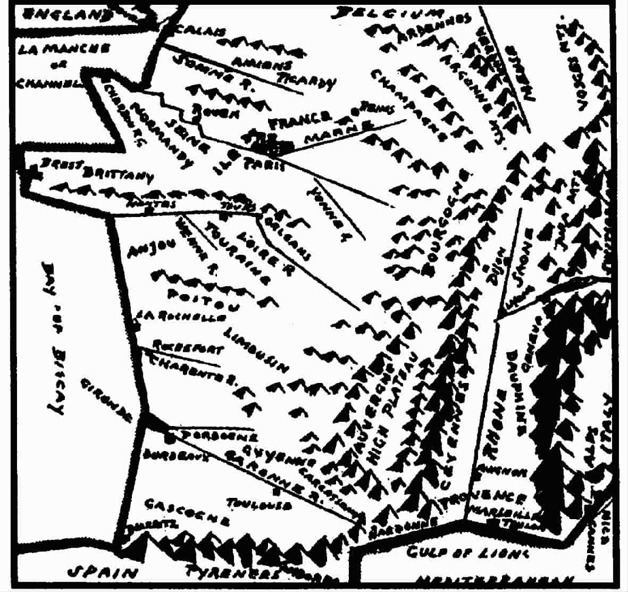 这里,我们遇上了政治地理学上的一个不解之谜。2000年前,这片飘着共和国三色旗(这面旗帜日夜飘扬,因为法国人一旦举起一面旗帜就永远不会让它飘落,除非它已被时间与风雨磨损得无法辨认)的大部分土地乃是大西洋与地中海之间的西欧平原的一部分,何以有一天,这里会发展成为一个世界上最集权的国家?这里显然没有任何地理的因素。
