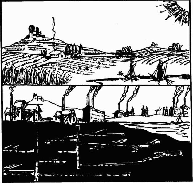地理影响主要在于北海潮流的改变。在14—15世纪,低地国家格外繁荣,中世纪的船只吃水较浅,今天许多商船达不到的城镇,当时就是主要的商业中心。后来,北海潮流改变,随之布鲁日和根特的港口意想不到地淤积了大量泥沙,于是这些港口完全被陆地淹没了。工会虽然开始时表现得似一股强大的力量,可是后来却逐渐退化为专制的鼠目寸光的组织,它们的存在似乎只是为了延缓或者阻碍任何已有的工业活动。当本地的旧王朝土崩瓦解之后,佛兰德斯又暂时被法国兼并了。没有人来干涉这一切。当时的形势以及两国之间的代表终于将佛兰德斯转变为一个安静的乡村:可爱的小农场、白色的农舍、美丽的废墟,这一切或许可以激起英国老妇人的情怀,让她们画出最拙劣的水彩画。但是,青草仍然会从老宅院中那些精心打磨的鹅卵石间冒出来,它们从未停止过生长。