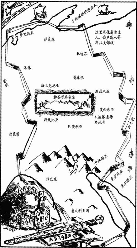 查理曼的另一个孙子获得了帝国的东半部分,就是罗马人称为“日耳曼尼”的地方。这片蛮荒强悍的土地从来就不属于古罗马帝国。奥古斯都大帝(渥大维)都试图征服这个“远东”地区,不过公元9年他的军队在条顿森林全军覆没后,此后他再也不敢越雷池一步。当地居民从未受到高度罗马文明的影响,他们用的语言是通俗的日耳曼语。条顿语里,“人民”(people)被称为“thiot”,因此基督教传教士称日耳曼语为“大众方言”或“条顿人的语言”(lingua teutiseea或者lingua teutisea)。后来把“teutisea”一词改成“deutsch”,这就是“德意志”(Deutschland)这一称呼的来源。