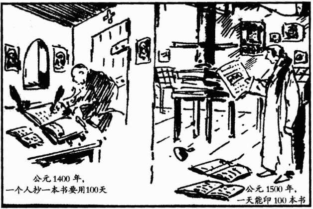 就这样,“表现”继续发展。不久以后,整个意大利(很快是整个欧洲),到处都是这样勇于“表现”的男男女女,他们生活和工作的目的就是给我们人类的知识、美与智慧的宝藏里,加上自己的一些贡献。在德国的梅因兹城,约翰·古登堡刚刚发明了一种印刷书籍的新方法。他研究了古代的木刻法,对现行方法进行改良,可以把软铅制成的单个字母排列组合在一起形成单词及整篇的文字。尽管他为了获得印刷术的发明权而导致倾家荡产,最终死于贫困;但是他伟大的“表现”却使得他流芳百世,世人受益匪浅。