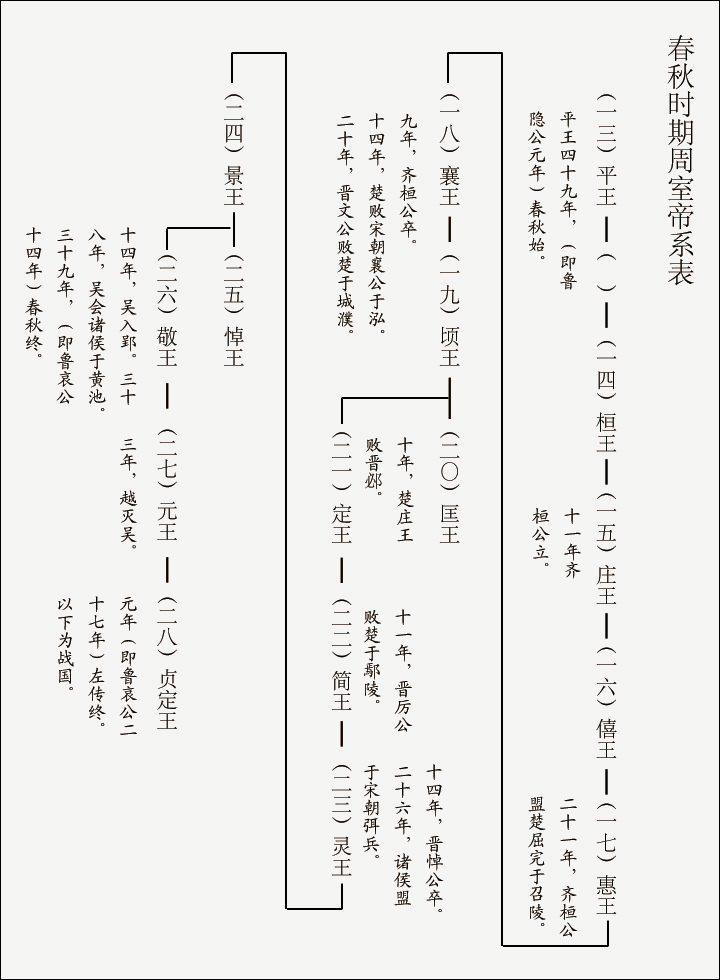 平王崩,鲁不奔丧。桓公二十余年,五聘鲁。【鲁为东方姬姓诸侯之宗国,平王之立,鲁盖不之拥戴,王室命令因此不行于东诸侯。故桓王继位,乃竭意联欢于鲁也。】郑庄公射桓王中肩。【平王之东,与晋、郑诸国相狼狈,惟至平王晚年,似有转亲虢国之意。(殆恶郑之专。)故左传谓:“王贰于虢,郑伯(庄公)怨王,王曰:‘无之。’周、郑交质。”及平王卒,周人终用虢公,与陈、蔡、虢、卫伐郑,为郑所败。盖王室既东,亦渐有意转变其往日之地位与关系,而卒于不能自拔也。虢于惠王二十二年为晋所灭,申则于庄王时为楚所灭,自是王室益不振。】