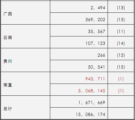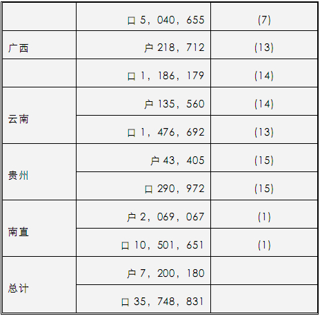 又按:南直苏州府户600,755,口2,011,985。松江府户218,359,口484,414。常州府户254,460,口1,002,779,苏、松、常三府合计,户数超过于湖广、福建、四川、广东、广西、云南、贵州、山西、河南、陕西、北直诸省,口数超过于福建、四川、广西、云南、贵州诸省,其繁荣可见。【又按:清代以江南(江苏、安徽)、浙江、江西、福建、湖南、湖北为大省,顺天(河北)、山东、山西、河南、陕西、甘肃、四川、广东为中省,广西、云南、贵州为小省。】