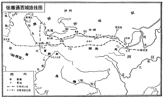 公元前138年,张骞奉汉武帝之命率领随行人员100多人出使大月氏,欲与大月氏结盟夹攻匈奴,他们越过葱岭,途中虽为匈奴扣留,时间长达10余年,但始终没有屈服,后伺机逃脱,西经大宛(今中亚费尔干纳盆地)、康居(今中亚西尔河流域)到达大月氏。此时,大月氏已臣服大夏,安居乐业,无意还击匈奴。张骞在大月氏留居一年多,见事不成,只好回国。途中又被匈奴所俘获,直至匈奴发生内乱,才乘机逃出,返回长安。张骞出使西域,前后历时13年,虽未竟使命,然而了解到了西域的风土人情,有“凿空”(开通道路)之功。