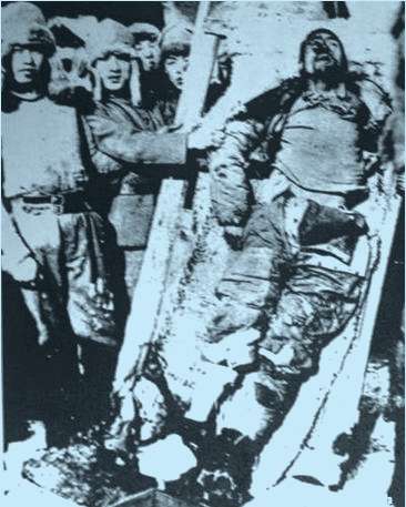 伪警察大队展示杨将军遗体,左边两个都是中国人。日军后来还残忍地割下了杨靖宇的首级示众