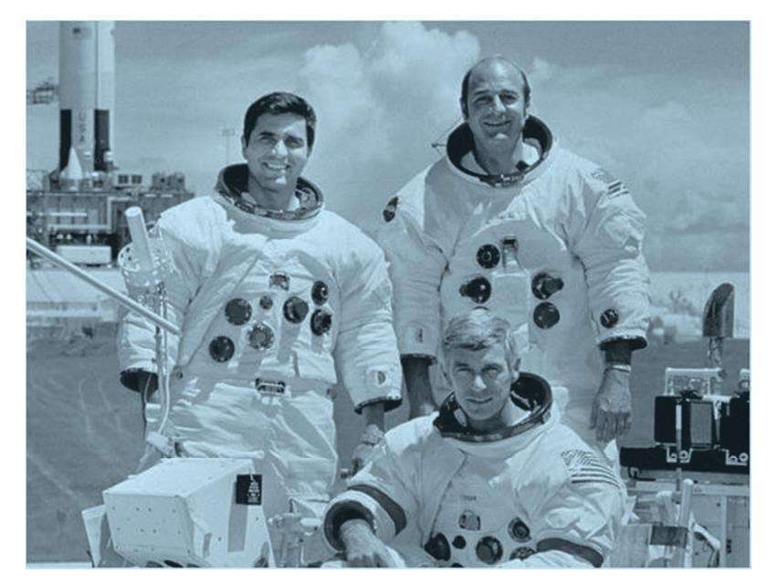 “阿波罗17号”的三名宇航员:哈里森·施密特(左一),尤金·赛尔南(右前),罗纳德·埃万斯(右后)