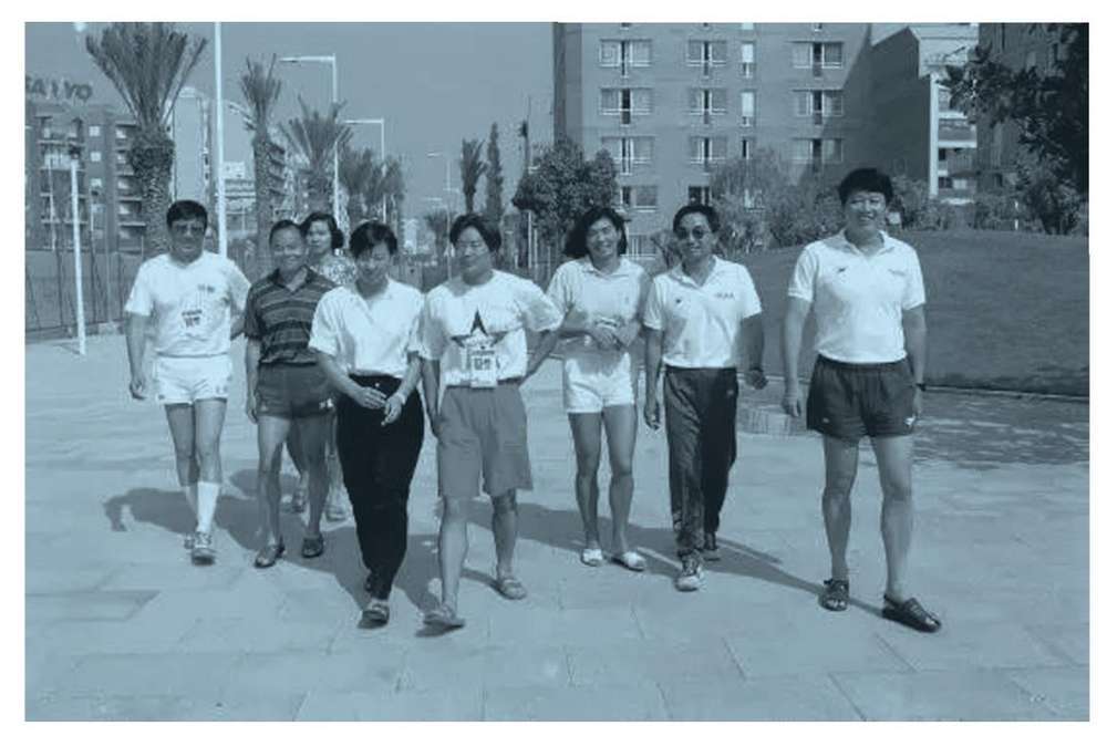 当年的中国游泳女队:(从左至右)冯晓东、陈运鹏、杨文意、钱红、林莉、庄泳、周明和张雄。令人唏嘘的一张照片