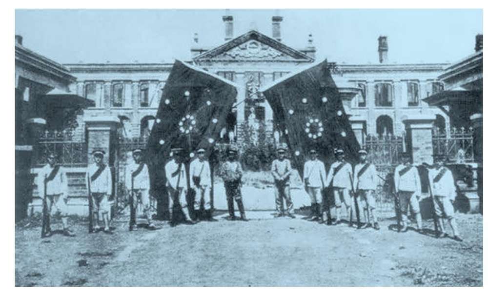 武昌起义革命军,背后是革命军旗帜“十八星旗”