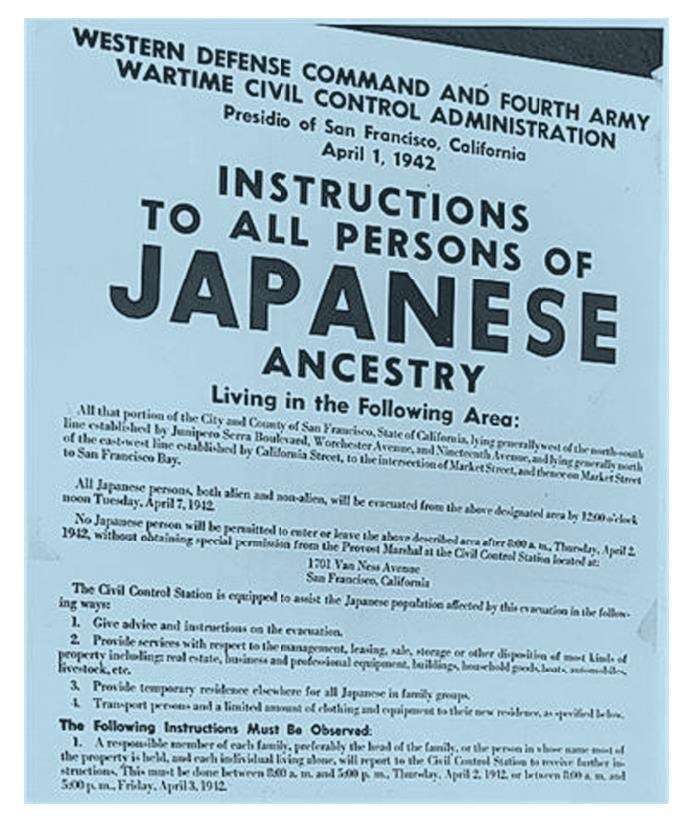 按照9066号法令规定,总统授权战争部建立“军事区”,可以命令“任何人或所有人”撤离。