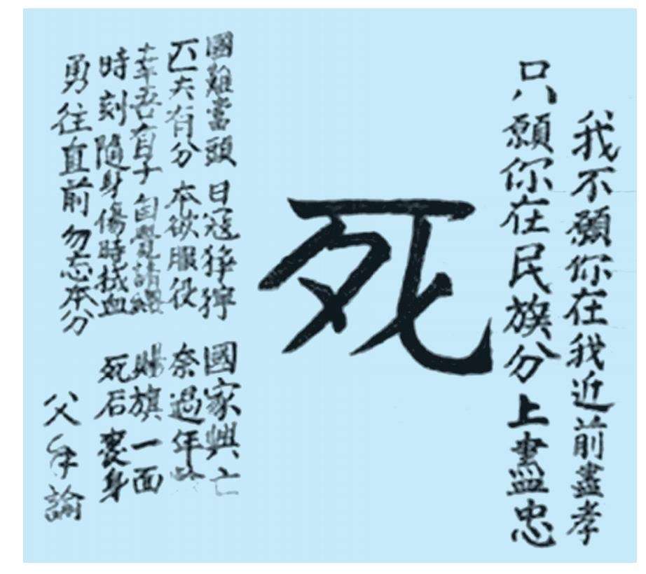 “我不愿你在我近前尽孝,只愿你在民族分上尽忠。国难当头,日寇狰狞。国家兴亡,匹夫有分。本欲服役,奈过年龄。幸吾有子,自觉请缨。赐旗一面,时刻随身。伤时拭血,死后裹身,勇往直前,勿忘本分。父手谕”