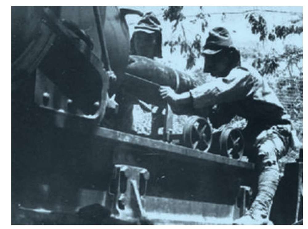 日军用120毫米加农炮发射毒气炮弹。士兵都带着防毒面具。此照片为日本方面的照片,照片上盖着明显的“不许”印戳