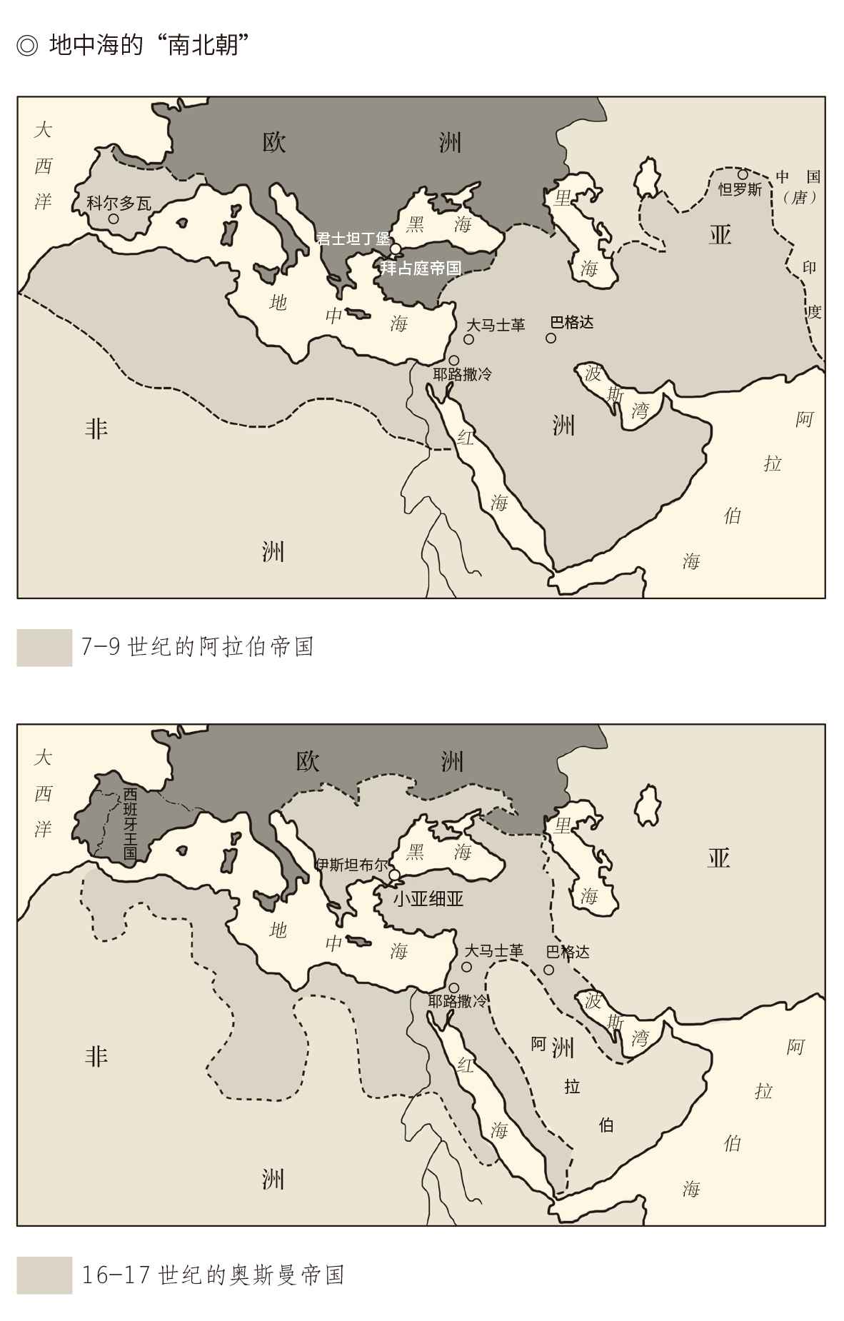 海,主要是地中海,然后是黑海和里海。其实看看地图就知道,两大宗教几乎一开始便以地中海为界:之南是伊斯兰的地盘,之北是基督教的天下。以后的走向也一样:基督教向北,然后向西传播到南北美洲;伊斯兰向南,然后向东传播到印度半岛西部、马来半岛南端和印度尼西亚。