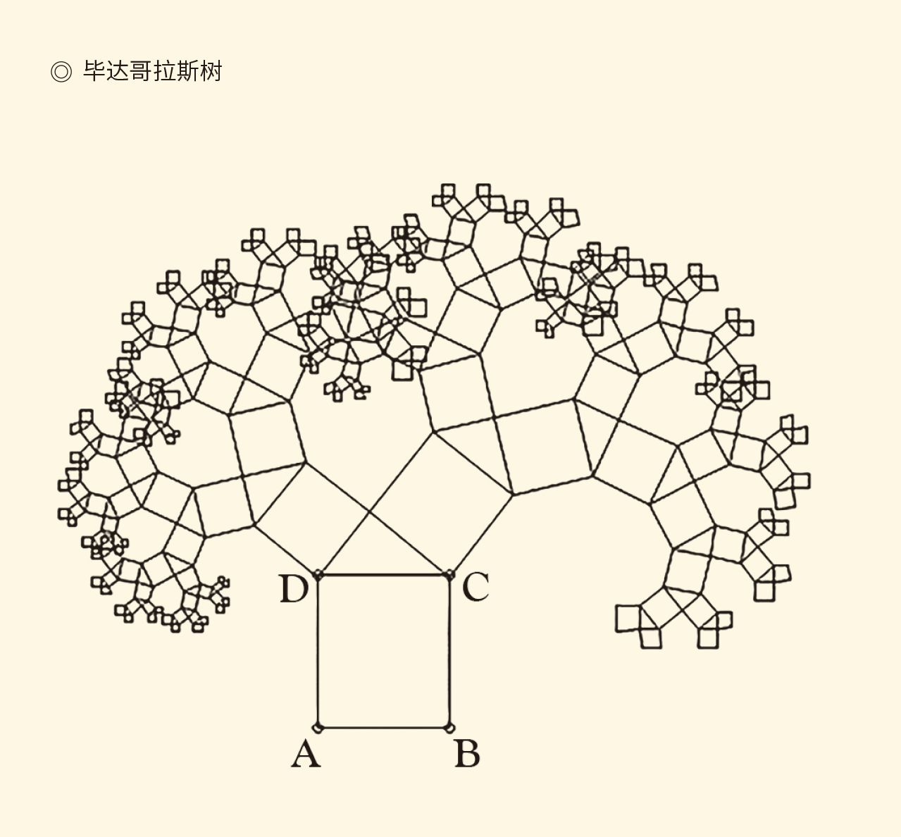 毕达哥拉斯根据勾股定理绘出的可以无限重复的图形,因为形似树,被称为毕达哥拉斯树。图中两个相邻小正方形面积的和等于相邻大正方形的面积;直角三角形两个直角边的平方和等于斜边的平方。毕达哥拉斯学派喜欢把数描绘成各种几何图形,正所谓“凡物皆数”。