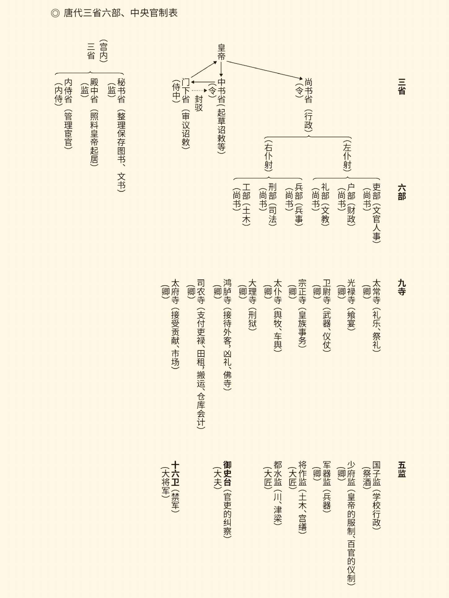 简单地说,三省六部就是隋唐两代的中央政府。其中三省指中书省、门下省、尚书省,六部则是尚书省下属的六个职能部门:吏部、户部、礼部、兵部、刑部和工部。这个制度意义重大,其影响既是历史性的,也是世界性的——现在我国中央政府的部门仍然叫部,日本的则仍然叫省。[6]