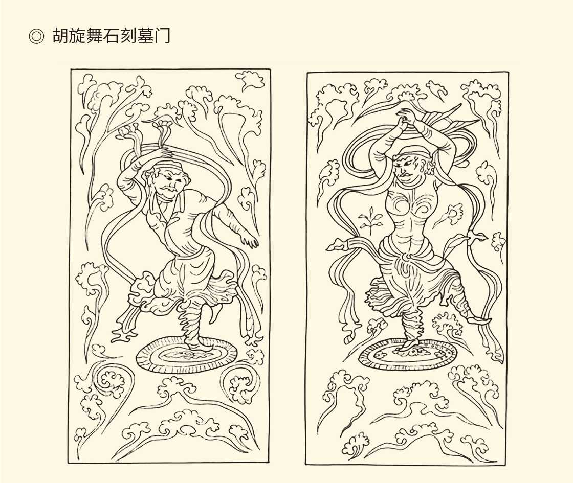宁夏盐池县苏步井乡窨子梁唐墓出土。门均呈长方形,出土时有铁锁锁扣,每扇石门正中浅雕一个胡旋舞男子。
