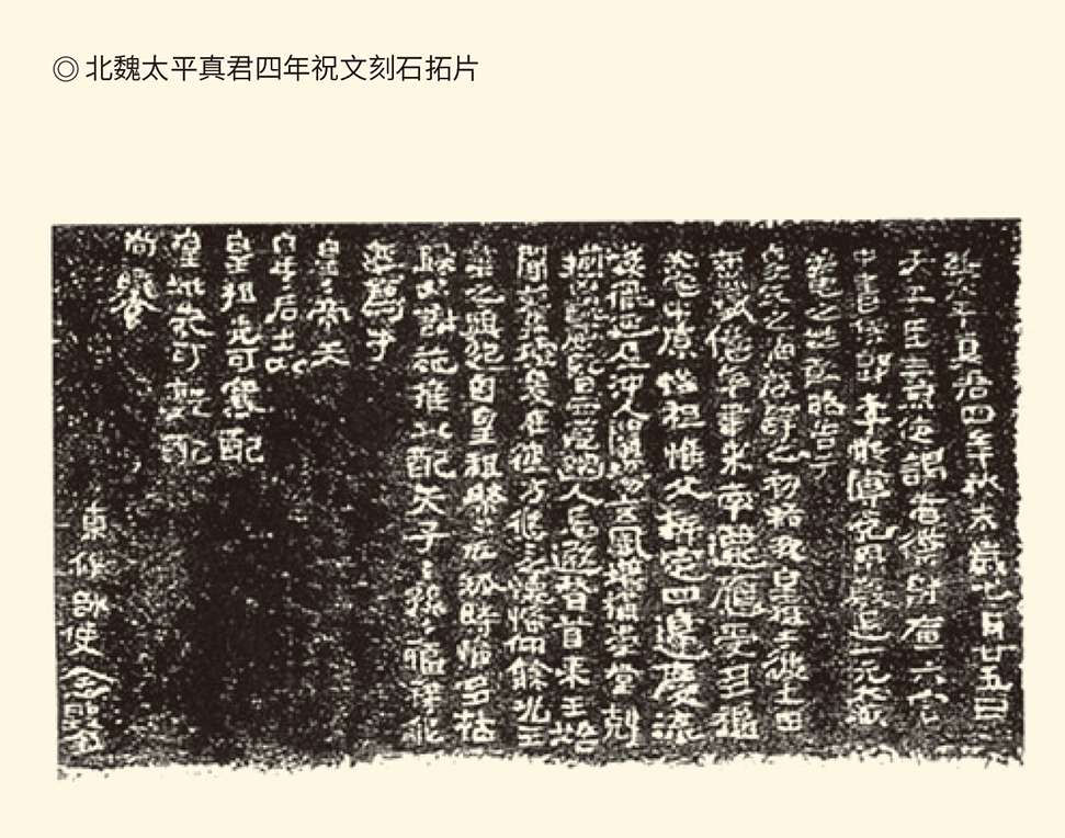 维太平真君四年癸未岁七月廿五日天子臣焘使谒者仆射库六官中书侍郎傅用骏足一元大武柔毛之牲敢昭告于皇天之神启辟之初佑我皇祖于彼土田历载亿年聿来南迁应受多福光宅中原惟祖惟父拓定四边庆流后胤延及冲人阐扬玄风增构崇堂剋翦凶丑威暨四荒幽人忘暇稽首来王始闻旧墟爰在彼方悠悠之怀希仰余光王业之兴起自皇祖绵绵瓜瓞时惟多祜归以谢施推以配天子子孙孙福禄永延荐于皇皇帝天皇皇后土以皇祖先可寒配皇妣先可敦配尚飨东作师使念凿