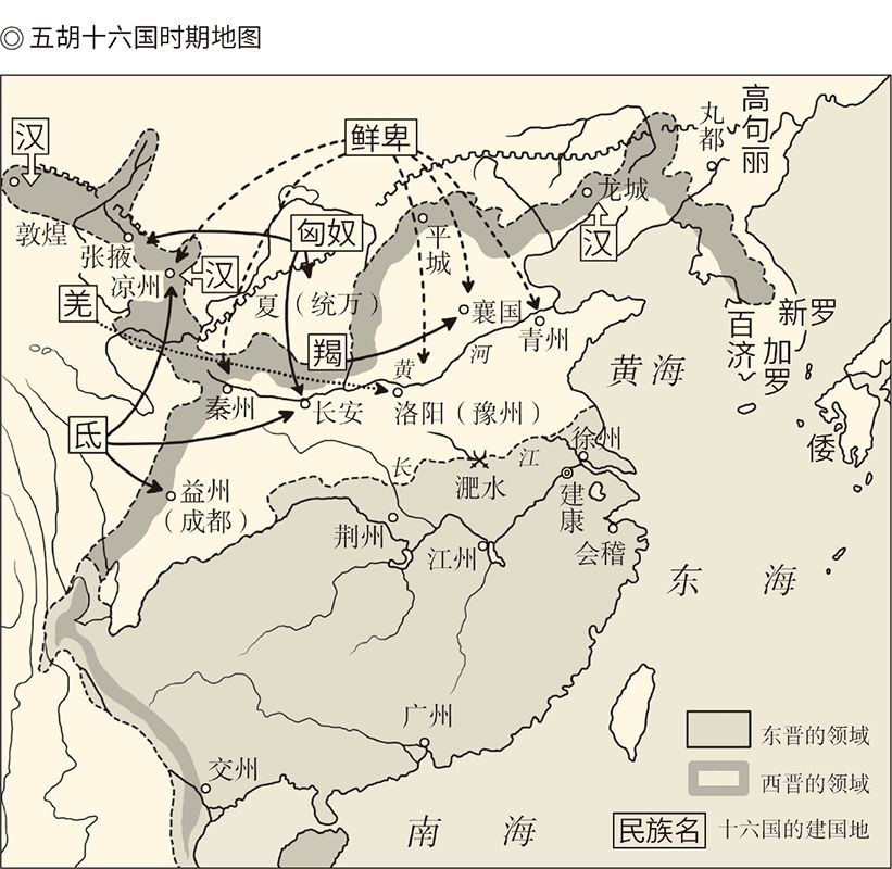 五胡十六国是一团乱麻。西晋惠帝至南朝刘宋这一百三十六年间,匈奴、羯、鲜卑、氐、羌,五个少数民族在中国北方建立政权。晋王朝丢掉了关中,疆域缩到长江沿线。引自《中华的崩溃与扩大:魏晋南北朝》。