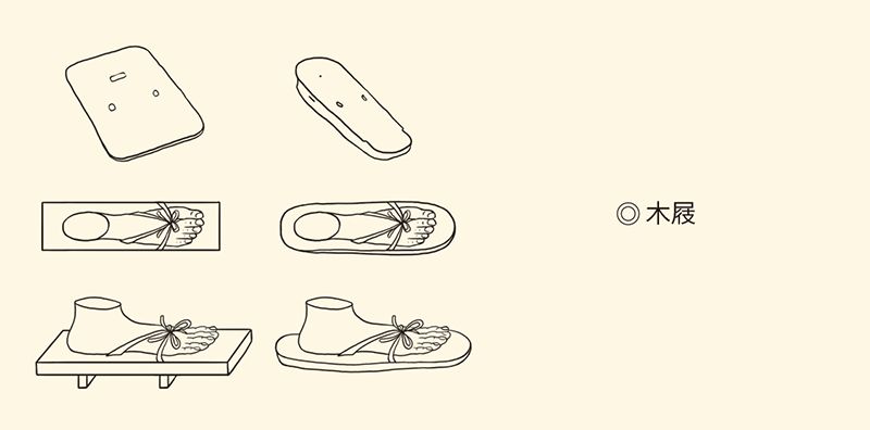 据南京六朝博物馆所藏木屐绘制。木屐,以薄木板为底,两块木片嵌在鞋底作为屐齿。根据“男方女圆”的规制,左图为男性,右图为女性。