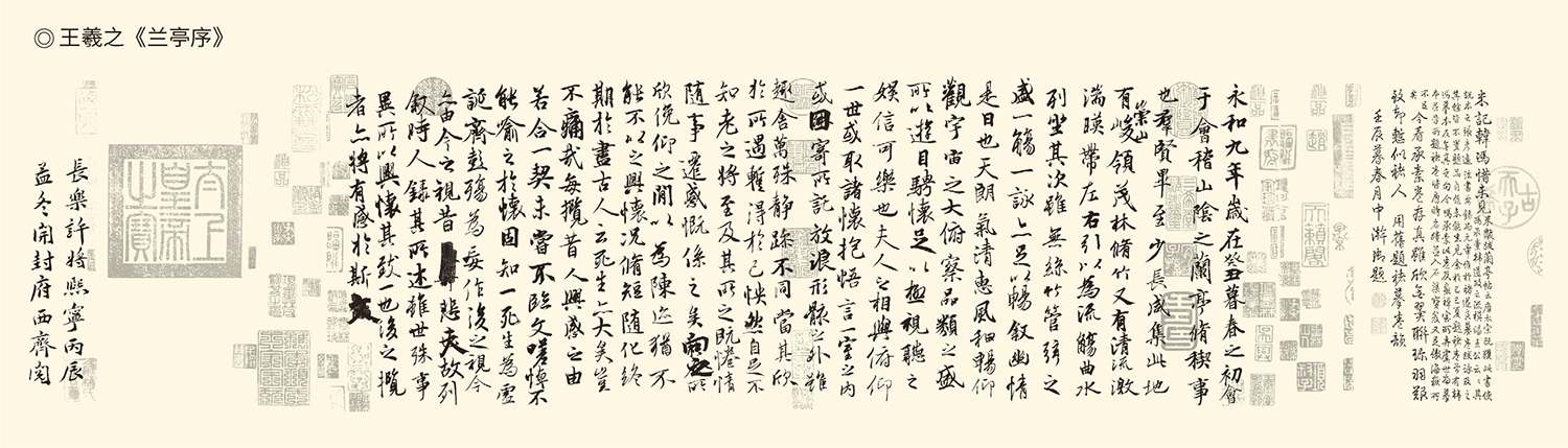 天下第一行书。图为唐代冯承素用双钩填墨法所摹《神龙本》,纵24.5厘米,横69.9厘米,现藏于北京故宫博物院。