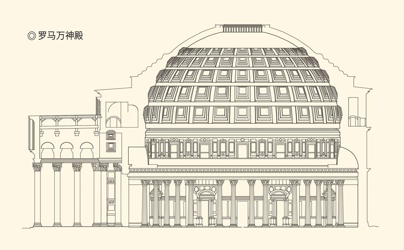 神殿结构简洁明了,主体呈圆形,顶部覆盖着一个直径达43.3米的穹顶,穹顶的最高点也是43.3米。顶部有一个直径8.9米的圆形大洞,是万神殿唯一的采光点。其圆形主体的前方有一个宽34米、深15.5米的柱廊,共有16根柱子,每根都是用整块的花岗石制成,柱子高达12.5米,底部基座的直径有1.43米。万神殿是古罗马建筑艺术的结晶,对西方的建筑史发展也有举足轻重的影响。据安托万·德戈德斯《罗马古建筑》。