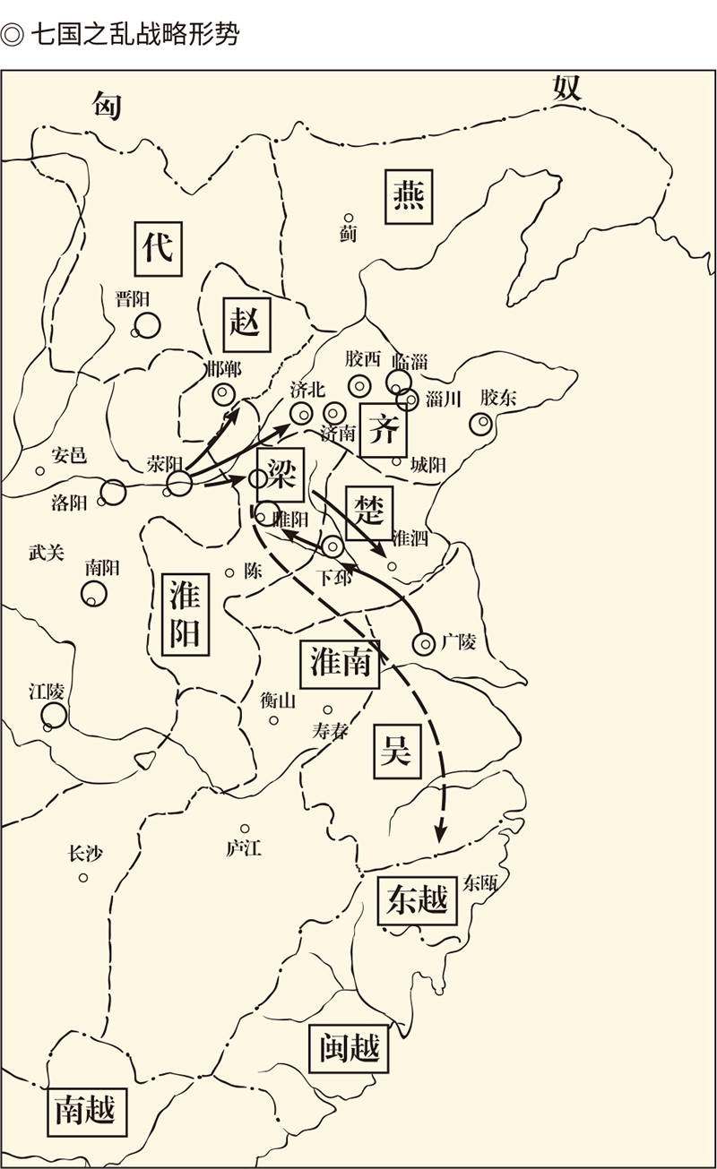 造反的诸侯,有吴王刘濞、楚王刘戊、赵王刘遂、菑川王刘贤、胶西王刘卬(读如昂)、胶东王刘雄渠、济南王刘辟光,所以叫七国之乱,也叫吴楚之乱。