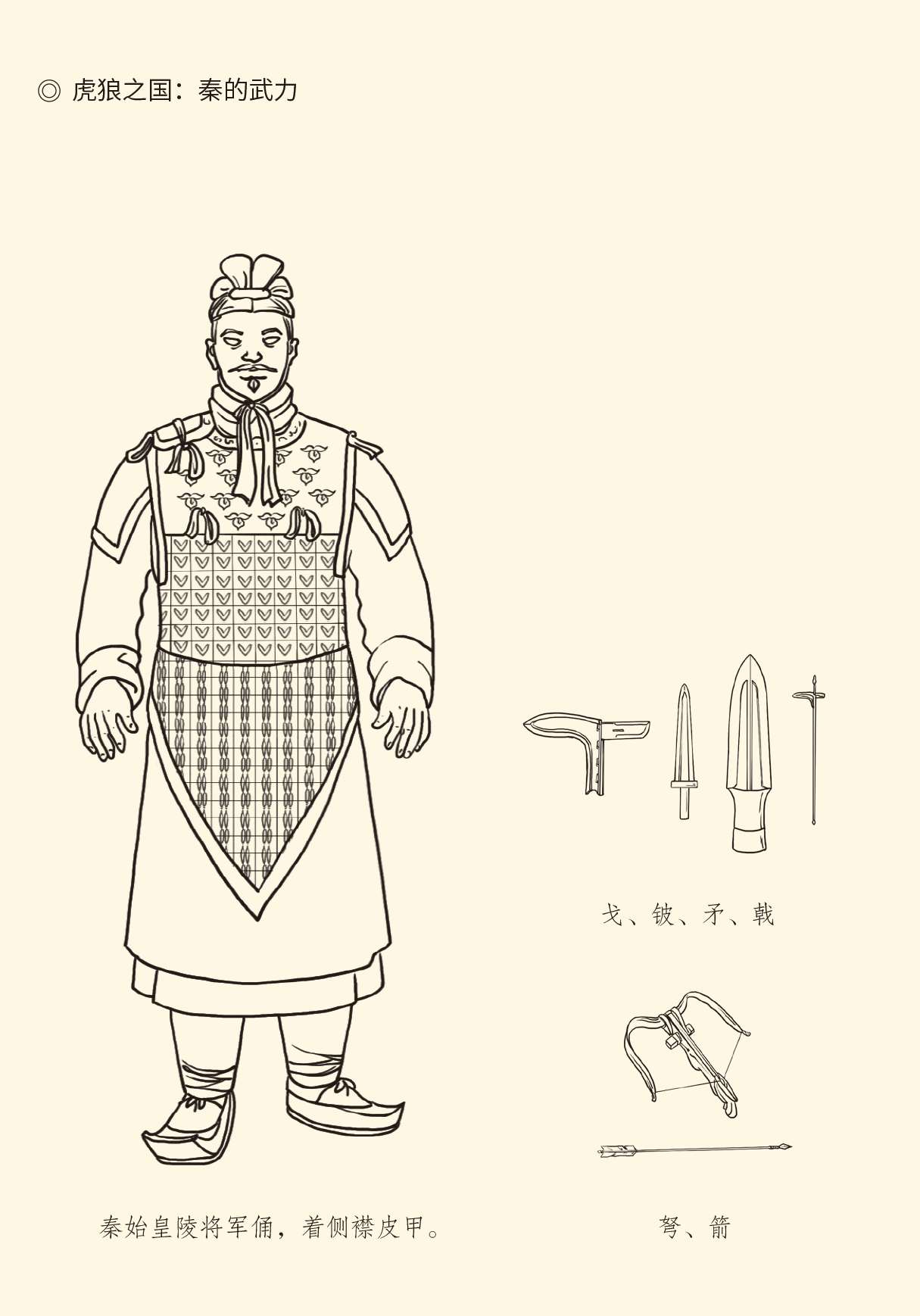 秦被称作“虎狼之国”盛行于战国时代,山东六国与秦在文化上的隔膜使得“虎狼之秦”成为固有印象。参见何晋《秦称“虎狼”考》。兵器据《博物》2005年第2期绘制,皮甲将军俑形象据陈大威《画说中国历代甲胄》。