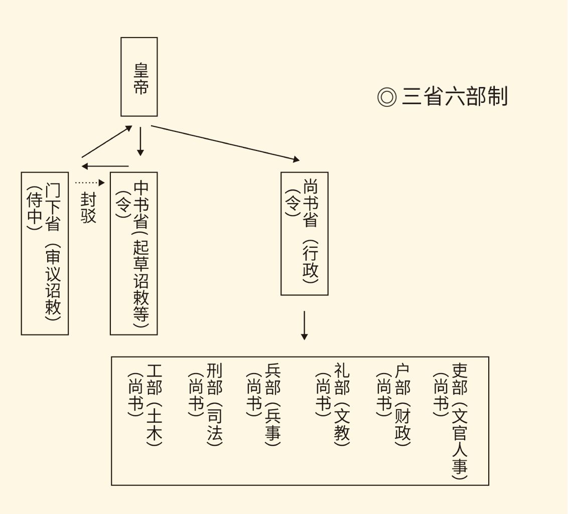 创设于唐初,经过几朝发展,三省六部制已经成为国家运转的核心机构。图据本中华史第十三卷《隋唐定局》。