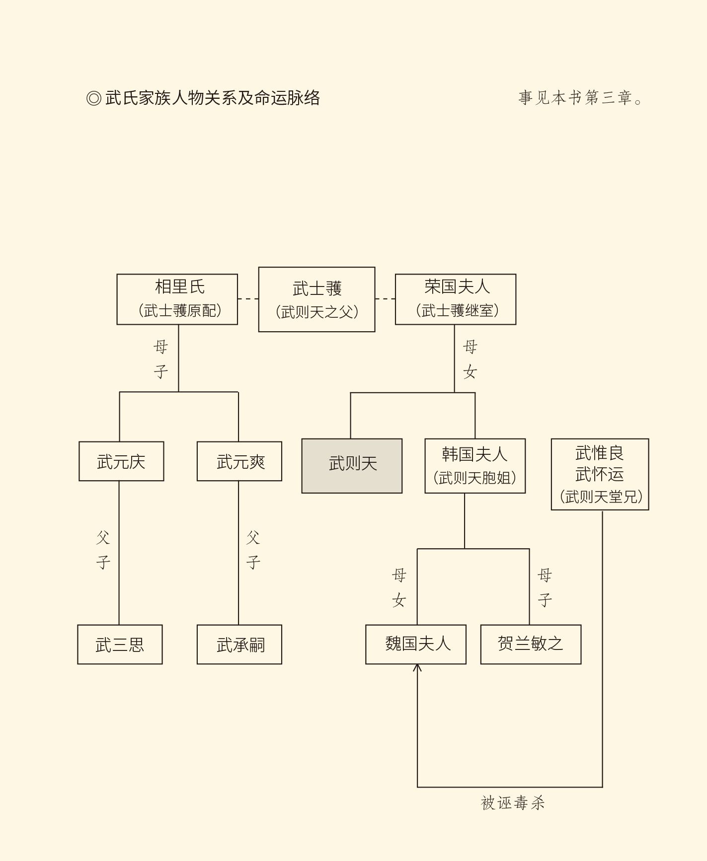 武承嗣是武则天同父异母哥哥武元爽的儿子。武元爽和哥哥武元庆与他们的后母,也就是武则天的生母荣国夫人关系恶劣。因此武则天当了皇后以后,便将这两个哥哥贬到地老天荒,表面上谦逊退让,实际上公报私仇。武元爽甚至还被牵连到武氏投毒案中,家属也被流放到岭南。这种一箭双雕借刀杀人的伎俩,武后一直玩得十分顺手。