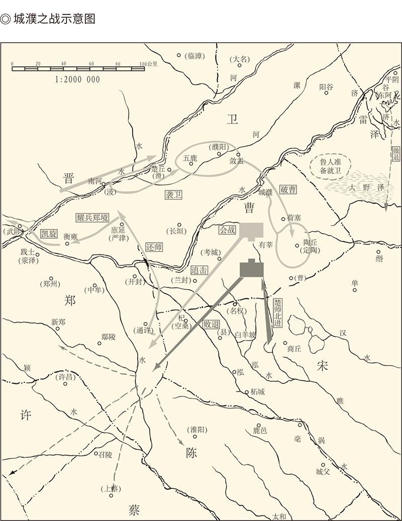 图据《中国历代战争史地图集》公元前632年初,晋文公进攻附楚的曹、卫,诱楚来援以解宋围。正月占卫五鹿,二月进至敛盂会盟齐昭公。三月攻占曹都陶丘。楚军不受调动,加紧围攻商丘。宋向晋告急。四月初楚军进至城濮,双方对阵。晋下军向楚右军猛攻,陈、蔡军一触即溃。晋上军佯装后退,待楚军追击突出,晋中军向其暴露翼侧攻击,断其退路,晋上军回头夹击。楚左军大部被歼,两翼均败退。