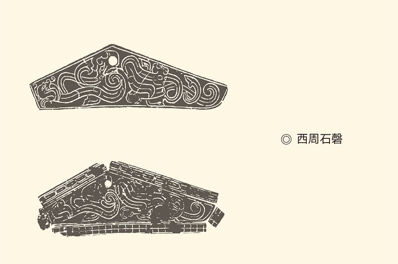 磬是和钟匹配的乐器。西周中期石磬发展成编磬。石磬略呈三角形,顶角为钝角,上有一穿孔可以悬挂。两底角略呈圆弧状。陕西扶风召陈遗址出土。