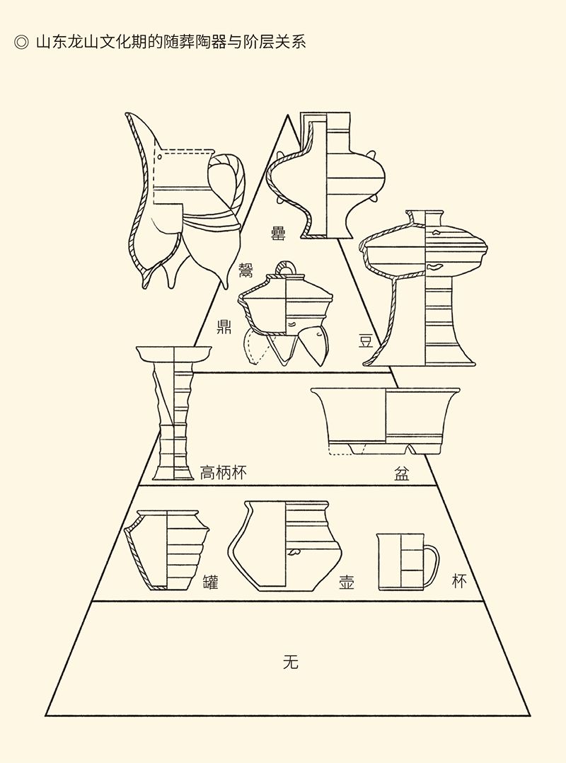 图中例示着山东临朐县朱封1号墓出土的陶器。这些随葬陶器与墓主的社会阶层关系对应。随葬品由上至下递减,直至完全没有随葬品。据许倬云《西周史》。