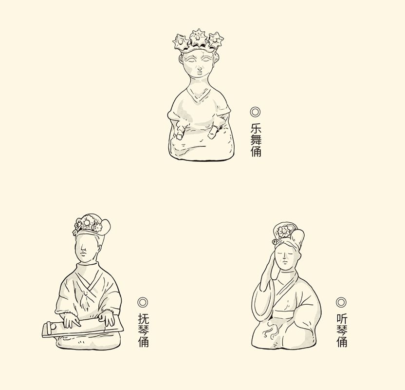 图据重庆忠县涂井崖墓群出土的乐舞俑、抚琴俑与听琴俑。三俑均为三国蜀汉文物,高约40厘米,高髻饰簪花。其中抚琴俑跽坐抚琴,听琴俑抚耳倾听。周瑜精通音律,据说演奏即使稍有失误,也一定瞒不过他的耳朵。江东因此有“曲有误,周郎顾”之语。