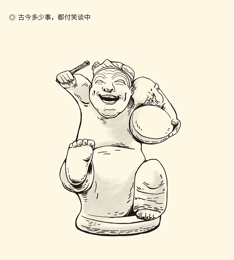 图据彩绘陶说唱俑,1982年四川新都三河马家山23号崖墓出土,高48厘米,国宝级文物。手舞足蹈的说唱者踞坐于石墩之上,眯缝着双眼,正唱到兴起处。