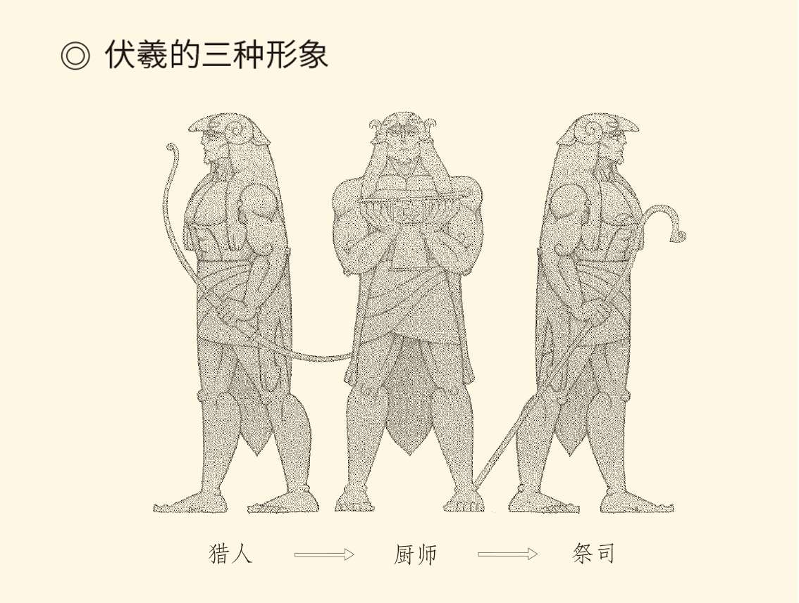 显然,这只能是伏羲的事。也只有发明了猎具、猎获了羊群的他,才有资格充当请神吃饭的厨师长和主持人。也因此,在祭祀仪式上,他依然得头戴羊角身披羊皮扮作羊人。只不过,这时的他不再是猎手,而是祭司。
