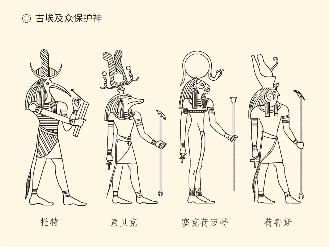 变成国家的“斯帕特”或“诺姆”,起先是部落国家,也是城市国家。他们都有自己的保护神。其中不少是动物,比如鹰、蛇、狼、公牛、狮子、鳄鱼、朱鹭;也有的“半人半兽”,比如厄勒藩丁的克努姆神,就是羊头人身。