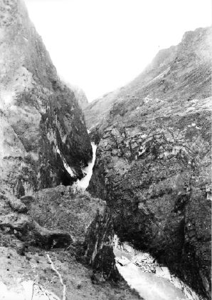 我站在虎跳峡的东端,可以看到北岸有一条与峡谷平行的小路。从我所站的地点可以清楚地看到小路的前半段,那两个外国人不久就会走在上面。我的导游说,那条峡谷山道总共30公里长。他指给我看当地农民在岩石上凿出的一段小路,上方耸立着一面乱石林立的崖壁。他说那是山道最危险的一段路。每年都有人被滚落的山石砸死,也有人被劲风刮落跌入深渊。