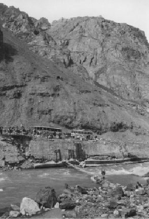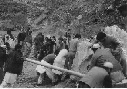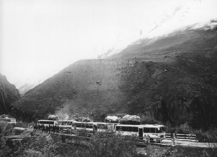 巴基斯坦人假装听不懂汉语,中国官员想让西方人给翻译一下,这时我和芬恩走到挡在路中央的巨石边。我俩捡起两块大石头,敲击巨石的边缘:巨石上掉下厚厚的一块;再敲,又掉下来一大块。敲了几下之后,两个巴基斯坦人走过来,加入了我们,然后又过来两个,接着又过来两个……不大一会儿,大约有50个人在猛击如房子般大的巨石,“房子”越变越小。每敲掉一块石头,旁观者便发出一阵欢呼。当欢呼声的回响渐渐消失的时候,大家突然停住了手。山谷另一边的岩石开始滚落。我们都抬头望向我们这一边的崖壁。此时山谷中阳光已所剩无几,我们看不到任何东西,除非它掉下来砸到我们。我们又继续干起来。终于,巨石上掉下来庞大的一块,大家都围拢过来目测巨石到对面崖壁的距离:除勉强能通过一辆大巴车外,仅有30厘米左右的空余。