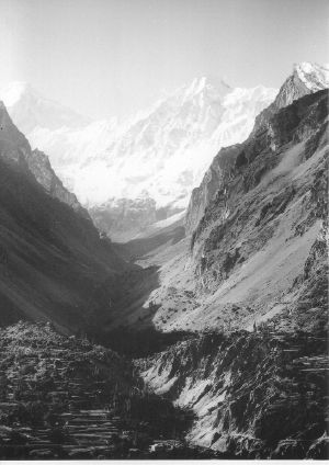 即使游客不打算登顶探险,他们也可以到登山者所使用过的大本营参观一下。就拉卡波希峰和迪兰峰而言,正常的登山路径是沿喀喇昆仑公路走到罕萨谷的西端,在这里公路跨过了罕萨河。河对岸有一条吉普车道通往米娜品村(Minapin)。通往这两座山峰的小道起点就在村子唯一的旅馆后面。步行7个小时就可登上大本营,再走一个小时就可到达一片巨大的、绵亘铺展在两座山峰脚下的草地。打算一日游的游客(去草地至少需要两天时间)可以在村子里雇用向导和装备。即使带上向导和所有装备,那里的狂风和严寒也令人望而却步,除非是在盛夏季节。当时已是深秋,这是我们返回花园般的“公园酒店”最好的借口。在酒店,我们写写明信片,偶尔瞄一眼穿着纱丽、戴着头巾为我们晾晒衣服的店主可爱的女儿——我们太懒了,懒到都不愿意自己洗衣服。