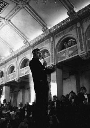 派对在八楼举行,门口有领班,凭请柬才能进入。我可没有请柬,而且我的紫色风衣,与那些狂欢客的衣冠楚楚也很不协调。于是领班把我揪了出来,示意我站到一边。不过,我早有准备。我向他出示了香港记者证——我正为香港的一家英文电台工作,参与一档与旅游相关的节目制作。为了让我看上去更可信,我还在脖子上专门挂了一部相机。这领班大概没有想到电台记者其实是不用相机的,反正他一挥手,就让我进去了。这样我就加入了这个由五百多人组成的狂欢组织,加入到这些穿着晚礼服的绅士淑女当中。