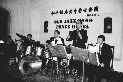 远远地,我看见出租车频繁出入和平饭店,狂欢客纷纷从车上下来。于是,我连忙出门跨过苏州河上的一座桥,混进了他们的队伍,与几对夫妇一同走进和平饭店的旋转门。