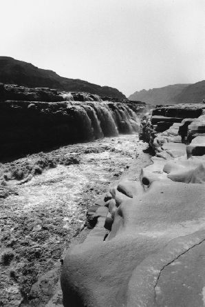 我们走过的这段河谷叫“龙槽”,是一条四公里长的深沟。这条深沟,是瀑布凭借连砸带刷的巨大力量,在玄武岩河床上“划”出来的。同时据我的教授同伴讲,壶口瀑布还是一道会移动的瀑布。它对悬崖面的巨大冲刷力,使它自己以每年四厘米的速度向上游移动。这个速度也可以说每二十五年一米,一世纪四米,或者说从北宋至今一千年往后退了四十米。随着瀑布向上游退却,龙槽也跟着向上游延伸。从瀑布“吐槽”四公里来估计,它的形成是最近十万年的事。看来,正是在最近的十万年里,从“天上来”的黄河水以万钧之力把群山划了一道口子,一泻千里,奔流到海不复回。由于龙槽的存在,除了源头一带,这里的黄河是最窄的了,两岸只相隔四十米。乍看起来,你就好像能跳过去似的。听说飞车高手埃维尔·克尼维尔(美国飞车高手,已于2007年去世。——编者注)确实有计划在这里飞越黄河。他能不能成功,恐怕不好说。