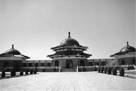 公元1227年,成吉思汗一命归天,棺椁起初安放在外蒙古。五十年后,他的孙子忽必烈完成了问鼎中原的大业,建立了元朝,成吉思汗陵就被移到这一带,棺椁安放在黄河最北弯道的南岸。这样做的目的是为了便于皇家祭祀。第二次世界大战期间为了妥善保管,棺椁曾转到甘肃,之后又转到青海,最终在1958年又回到这一地区,安葬在东胜以南,就是我现在下车的这个地方。自从那时起,中国政府就建造了一座瓦顶建筑,不仅用来安放成吉思汗的棺椁,还用来安放他的后妃和长子的棺椁(实际上这座陵墓只是成吉思汗和其后妃的衣冠冢,陵墓内并无棺椁。——译者注)。这座建筑与我在中国见到的其他任何建筑都不一样,它像三个并排的蒙古包,或者我干脆就叫它蒙古包吧。在“蒙古包”内部存放有许多据说曾经属于成吉思汗的物什,包括他的剑和马鞍。