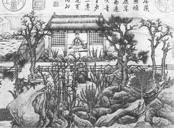 隐士的茅篷(草堂)。8世纪卢鸿作。这是画者隐居嵩山时创作的十幅画作中的第一幅。嵩山是终南山最东面的支脉。