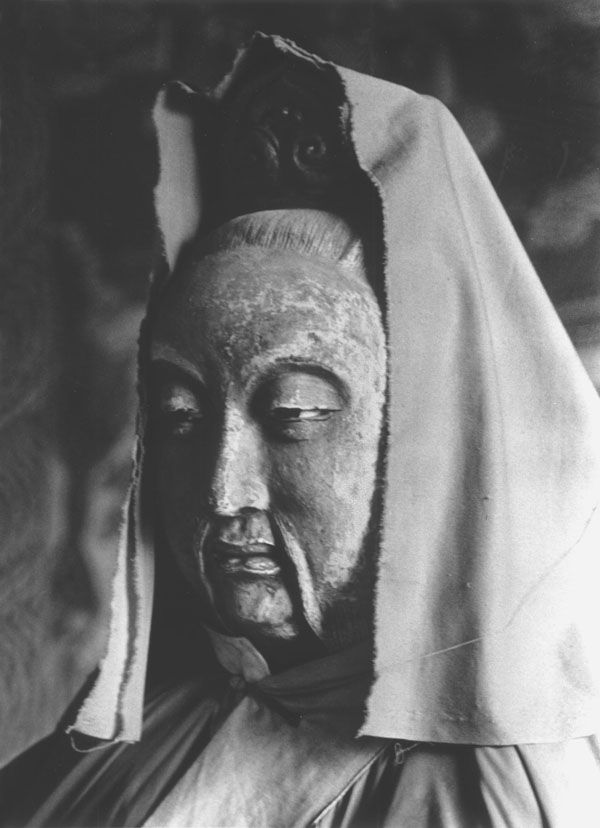 我们受到一位农夫的欢迎。他戴着一顶蓝色的水手帽,双颊如此红润,以至于开始我以为他是荷兰人。他领我们从两座农舍中间穿过,打开了那最后一位道姑前年遗弃的祠堂。祠堂里面的墙上全是壁画,展示了周朝的兴衰,以及老子环游世界的经历。祠堂里的主要塑像是玉皇大帝。在元始天尊创始万物以后,玉皇大帝就接过了道教万神殿的领导权。他的右边是老子的塑像,它是用黏土做的,头上顶着一块红围巾,散发出一种古怪的韵味,与我以前所见到过的所有这位圣人的塑像都不相同。当向导在玉皇大帝面前点燃香烛的时候,我给老子拍了照。