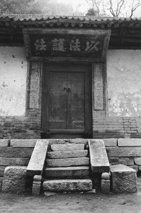 半路上,我在净业寺停下来。在寺庙的大门上,我看见了我第一次来这里时欢迎我的那几个字“以法护法”。寺庙的狗叫起来。一位和尚出来了,把我领了进去。他告诉我,这只狗正在将功赎罪。几个月前的一个雨夜,它睡着了,有人翻墙溜了进来。因为杜仲树的树皮有医用价值,于是入侵者就把两棵杜仲树的树皮剥去卖了。这两棵树现在死了。它们是一千三百多年前道宣亲手种在寺庙的小院子里的。