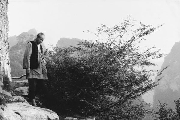 我比自己想象的还要饿,因此没有给看门狗留下任何吃的——刚才进来的路上,它差点把我的腿咬掉了。之后,志诚领我沿着一条石阶下去,这条石阶就在斋堂外面,它沿着悬崖的西坡延伸下去,经过一座木板桥,通向喇嘛洞。一百年前,一位著名的喇嘛曾经住在这里,他在墙上写了一个藏文咒语,志诚把它指给我看。他说,眼下住喇嘛洞的那个和尚现在在西安。悬崖上还有一段铭文,赞美嘉五台的幽静。那是一位名叫性空的和尚写的,落款是公元627年。它说明,至少在宗密来此之前二百年,这里就已经是一个修行场所了。