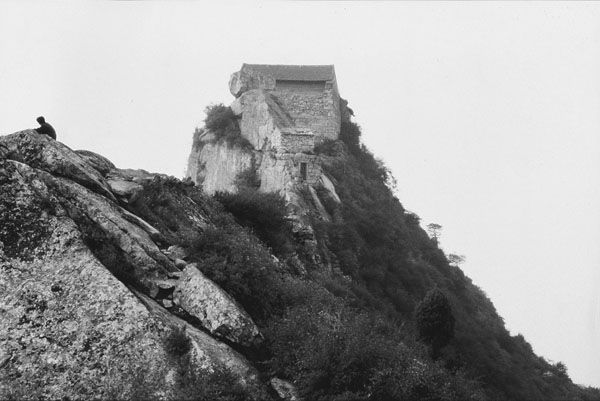 至少我不用再穿衣服了。我穿上鞋,走出寺庙的后门。走过山顶的龙脊,我在一条小路前停下来。这条路向下延伸,经过几座杂草蔓生的塔,然后掉头向上,通到西面一百米处、邻近的雪华山的峰顶上。19世纪末,天然曾经在一座小石屋里住了五十年,现在我能够看见那座石屋的一角。我没有选择去她的石屋的路,继续向前又走了五十米,直到这条路在此分岔。主路继续向前,经过观音洞,最终向下消失在嘉五台的后坡。我走了另一条路,步行约三十米后,到了宗密过去的住处——五华洞(“五华”是“华严宗五祖”的缩语)。它包括一堵石头墙,这堵石头墙垒在一个突出物的前面。房子一直延伸到那个突出物的上面,就在那里,石头屋顶陷下去了。门向东,面朝着东南十公里处的太行(xíng)山的顶峰——此时朝阳正从那里冉冉升起。