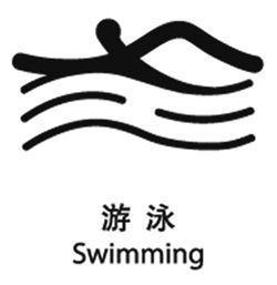 。游泳的符号以几条弯曲而柔媚的线条,表现水的流动形态,上面是人奋力划动双臂,有强烈的动感,这也来自于篆书。如“走”(