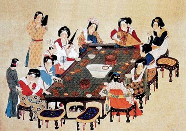 唐代老百姓和上层贵族大量引进外来的服饰、饮食和各种习俗,当时的长安城中“胡服”盛行,胡风弥漫。所谓胡服,主要是来自西域少数民族和波斯、康国、安国等国的服饰,其特征是短衣窄袖,以方便骑马出游狩猎。唐代女子喜欢披肩巾,是从中印度传入的。当时来自中亚、西亚的商人在长安等地开了许多酒店、珠宝店、杂器店。胡商经营的酒肆多在长安西市和春明门至曲江池一带。酒肆中有西域名酒(如高昌产的葡萄酒、波斯产的三勒浆以及龙膏酒等),还有富有异国情调的胡姬当垆。胡姬是来自中亚、西亚的女子,能歌善舞。到胡姬酒肆中饮酒聚会成了一时风尚。大诗人李白的诗中常有这一类的记载,如:“胡姬貌如花,当垆笑春风。”“落花踏尽游何处,笑入胡姬酒肆中。”这种胡风、胡俗的盛行,显示一种蓬勃的朝气和青春的旋律,正是学者们盛赞的盛唐气象的一个特色。